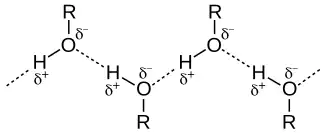 Высокие температуры кипения спиртов объясняются наличием межмолекулярных водородных связей[56]. Энергия водородной связи значительно ниже, чем энергия ковалентной химической связи. Так, например, для метанола энергия водородной связи составляет 16,7 кДж/моль[59] , тогда как связи C−H, C−O и O−H имеют энергию 391,7, 383,5 и 428,8 кДж/моль соответственно[60]. Тем не менее, влияние водородных связей на физические свойства спиртов весьма значительное.