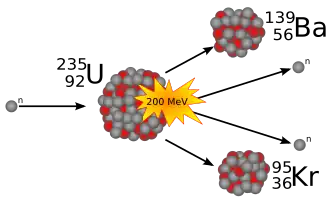 В 1938 году немецкие физики Отто Ган и Фриц Штрассман открыли непредсказанное явление, происходящее с ядром урана при облучении его нейтронами. Захватывая свободный нейтрон, ядро изотопа урана 235U делится, при этом выделяется (в расчёте на одно ядро урана) достаточно большая энергия, в основном в виде кинетической энергии осколков и излучения. Позднее теория этого явления была обоснована Лизой Мейтнер и Отто Фришем и независимо от них Готтфридом фон Дросте и Зигфридом Флюгге[9]. Данное открытие явилось истоком как мирного, так и военного использования внутриатомной энергии.