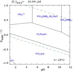 Уран может проявлять в водных растворах степени окисления от +3 до +6, вне контакта с водой наблюдается также степень окисления +2[2]. Наиболее характерны степени окисления +4 и +6.