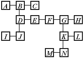 Пример соединения компьютеров в сети BITNET. Прямоугольники обозначают компьютеры, буквы — их имена, а линии — пути связи между компьютерами.