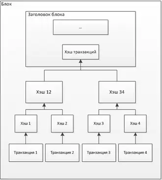 Блок состоит из заголовка и списка транзакций. Заголовок блока включает в себя свой хеш, хеш предыдущего блока, хеши транзакций и дополнительную служебную информацию. В системе Биткойн первой транзакцией в блоке всегда указывается получение комиссии, которая станет наградой майнеру за созданный блок[12]. Далее идёт список транзакций, сформированный из очереди транзакций, ещё не записанных в предыдущие блоки. Критерий отбора из очереди задаёт майнер самостоятельно. Это не обязательно должна быть хронология по времени. Например, могут включаться только операции с высокой комиссией или с участием заданного списка адресов. Для транзакций в блоке используется древовидное хеширование[14], аналогичное формированию хеш-суммы для файла в протоколе BitTorrent. Транзакции, кроме начисления комиссии за создание блока, содержат внутри параметра input ссылку на транзакцию с предыдущим состоянием данных (в системе Биткойн, например, даётся ссылка на ту транзакцию, по которой были получены расходуемые биткойны). Операции по передаче майнеру комиссии за создание блока не имеют «входных» транзакций, поэтому в данном параметре может указываться любая информация (для них это поле носит название англ. Coinbase parameter).