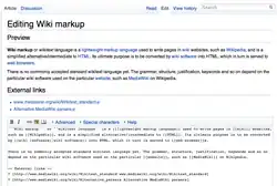 • Особый язык разметки — так называемая вики-разметка, которая позволяет легко и быстро размечать в тексте структурные элементы и гиперссылки; форматировать и оформлять отдельные элементы[8].