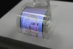 Также, как вариант, изогнутый дисплей (смартфона (напр., Samsung Galaxy S6/S7 Edge) или телевизора) — использована толстая пленка (толщина чуть более 1 мм), внутри которой находятся органические светодиоды (с обратной стороны матрицы, под слоем медной фольги расположен амортизирующий слой)[35].