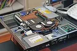 - Повышение надёжности сервера достигается резервированием, в том числе с горячим подключением и заменой (англ. Hot-swap) критически важных компонентов: