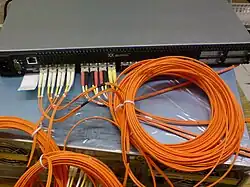 SAN-Свитч Qlogic SANbox 5600 с подключёнными к нему оптическими разъёмами Fibre Channel