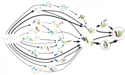 Folding@home использует модели марковских состояний, подобные представленной на рисунке, для моделирования возможных форм и путей сворачивания, которые может принять белок при конденсации из своего первоначального случайно скрученного состояния (слева) в свою естественную трехмерную структуру (справа)