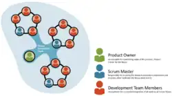 Кроме классической методики Scrum of Scrums (SoS) применяют методики LeSS[36][37][38][39], Nexus[40], RAGE, DAD[41], APM[42][43], SAFe[44]. Для очень больших проектов вместо LeSS применяют LeSS Huge[37]. Методики SoS и Nexus созданы Сазерлендом и Швабером[37] и преподаются на сертификационных курсах CSM и PSM.