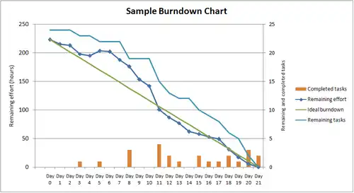 Диаграмма, демонстрирующая количество сделанной и оставшейся работы относительно времени на разработку проекта называется диаграммой сгорания (Burndown chart).