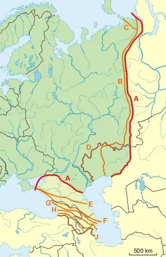 - ↑ По водоразделу Уральского хребта, реке Урал, и водоразделу Кавказского хребта.