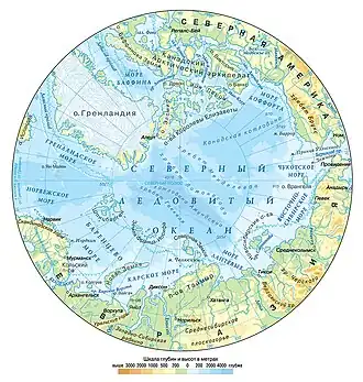 По особенностям рельефа в Арктике выделяют: шельф с островами материкового происхождения и прилегающими окраинами материков и Арктический бассейн. Область шельфа занята окраинными морями — Баренцевым, Карским, Лаптевых, Восточно-Сибирским и Чукотским. Рельеф суши российской Арктики преимущественно равнинный; местами, особенно на островах, гористый. Центральная часть — Арктический бассейн, область глубоководных котловин (до 5527 м) и подводных хребтов.