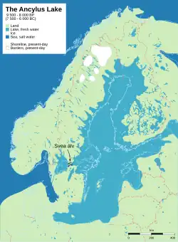 - Анциловое озеро — существовало в период 9—7,5 тыс. лет назад, когда Иольдиевое море утратило связь с океаном в результате подъёма суши.