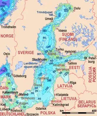 Балтийское море находится в пределах материкового шельфа. Средняя глубина моря 51 метр. В районах отмелей, банок, около островов наблюдаются небольшие глубины (до 12 метров). Имеется несколько котловин, в которых глубины достигают 200 метров. Самая глубокая котловина — Ландсортская (58°38′ с. ш. 18°04′ в. д.) с максимальной глубиной моря — 470 метров. В Ботническом заливе максимальная глубина — 293 метра, в Готландской котловине — 249 метров.
