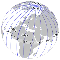 Долгота указывается как угловая величина в диапазоне от 0° (значение на нулевом меридиане) до +180° на востоке и −180° на западе. Греческая буква λ (лямбда)[7][8], используется для обозначения местоположения места на Земле к востоку или западу от нулевого меридиана.
