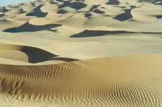 В других районах пустыни происходит накопление принесённых с ветрами песка и пыли. Таким образом происходит формирование песчаных дюн. Песок, образующий такие дюны, преимущественно состоит из кварцевых частиц, но песчаные дюны в природном национальном памятнике Уайт-Сандс («Белые пески») в штате Нью-Мексико в США образованы белым гипсом. Образование дюн происходит в местах, где воздушный поток встречает на своём пути препятствие. Накопление песка начинается с подветренной стороны преграды. Высота большинства дюн составляет от метров до нескольких десятков метров, также известны дюны, достигающие в высоту 300 м. Если дюны не закреплены растительностью, то со временем происходит их смещение в направлении господствующих ветров. При движении дюны песок переносится ветром вверх по пологому наветренному склону и осыпается с гребня подветренного склона. Скорость движения дюн в среднем составляет 6—10 метров в год.