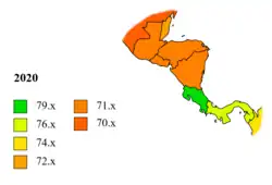 | Мир | 73,33 | 70,95 | 75,84 | 4,89 | 71,78 | 1,09 | 72,87 | −0,68 | 72,18 | −0,97 | 71,22 | 1,75 | 72,97 | 0,36 | 73,33 | 0,46 | 1,55 |