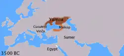 К началу II тыс. до н. э. начинается распространение индоевропейских племён на восток и запад. Андроновская культура, связываемая с индоиранцами, занимает обширные пространства Центральной Евразии (см. Синташта, Аркаим)[13]. Залогом успеха распространения индоевропейцев стало наличие у них таких новаторских технологий, как колесница и меч.