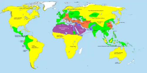 С началом бронзового века оформились и начали активно взаимодействовать два блока человеческих сообществ Евразии. Южнее центрального складчатого горного пояса (Саяно-Алтай — Памир и Тянь-Шань — Кавказ — Карпаты — Альпы) сформировались общества со сложной социальной структурой, хозяйством, основанном на земледелии в комплексе с животноводством, здесь появились города, письменность, государства. Севернее, в Евразийской степи сформировались воинственные общества подвижных скотоводов.