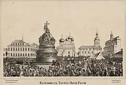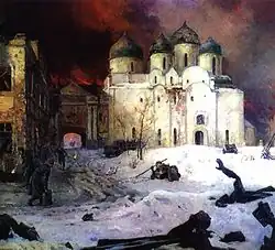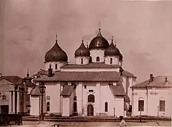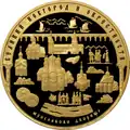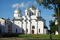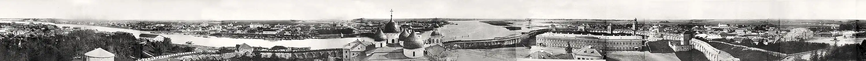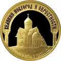 ![]() Против часовой стрелки, с правого верхнего угла: памятник «Тысячелетие России», Софийский собор, музей изобразительных искусств, Свято-Юрьев монастырь, Детинец, Ярославово Дворище | |||||