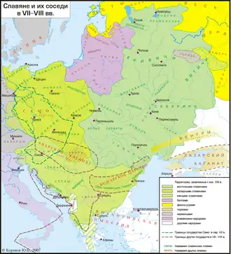 В VII веке возникло славянское селище на реке Прость[35][36]. Зачаточное поселение славян на Земляном городище (Старая Ладога) могло возникнуть около 700 года или даже ранее[37]. В первой половине 750-х годов в низовьях Волхова появились скандинавские поселения, но на рубеже 760—770 годов скандинавов вытеснили славяне[38]. В IX веке в истоке реки Волхов на окраине Славенского холма уже существовало поселение Рюриково Городище.