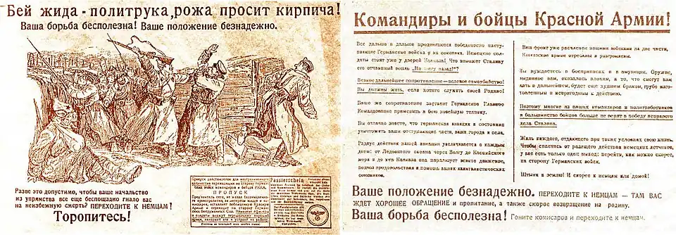 Одной из черт, унаследованных вермахтом от прусской армии, был антисемитизм, который пропаганда связала с неприятием коммунистической идеологии. Так, генерал-полковник Эрих Гёпнер, командир 4-й танковой группы, в своём приказе в начале мая 1941 года призывал подчинённых к победе над «еврейским большевизмом» и к безжалостному уничтожению «русской большевистской системы»[25]. Действия айнзатцгрупп были поддержаны и Манштейном, который рассматривал их как «суровое возмездие еврейству, идеологическому вдохновителю большевистского террора и его осуществляющему»[26].