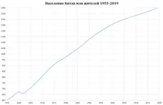 По численности населения[11] — 1 411 750 000 жителей (без Тайваня, Гонконга и Макао[12][13]) — занимает второе место в мире после Индии[14]. Уровень урбанизации равен 65 %[13]. Китай — многонациональное государство, но на сегодняшний день большинство его населения составляют этнические китайцы с самоназванием хань.