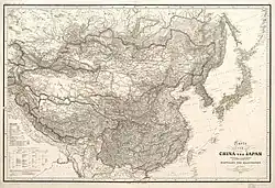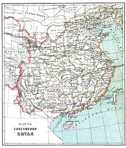 С востока страна омывается водами западных морей Тихого океана. На северо-востоке она граничит с КНДР и Россией, на севере — с Монголией, на северо-западе — с Россией и Казахстаном, на западе — с Кыргызстаном, Таджикистаном и Афганистаном, на юго-западе — с контролируемым Пакистаном Гилгит-Балтистаном, Индией, Непалом и Бутаном, на юге — с Мьянмой, Лаосом, Вьетнамом. Общая площадь территории составляет 9,6 млн км²[10]; занимает 4-е место в мире по территории среди государств мира по площади, уступая России, Канаде и США.