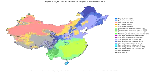 Климат Китая очень разнообразен — от субтропического на юго-востоке до резко континентального (аридного) на северо-западе. На южном побережье погода определяется муссонами, которые возникают из-за различных поглотительных свойств суши и океана. Сезонные движения воздуха и сопутствующие ветра содержат большое количество влаги в летний период и довольно сухие зимой. Наступление и отход муссонов в большой степени определяют количество и распределение осадков по стране. Огромные разницы по широте, долготе и высоте на территории Китая порождают большое разнообразие температурных и метеорологических режимов, несмотря на то, что большая часть страны лежит в области умеренного климата.