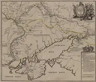 Летом 1711 г., когда Пётр I с 80-тысячной армией отправился в Прутский поход, крымская конница численностью в 70 тысяч сабель совместно с турецкой армией окружила войска Петра, оказавшиеся в безнадёжном положении. Сам Пётр I чуть не попал в плен и был вынужден подкупить турецкого визиря[66][67], что позволило ему подписать мирный договор на более выгодных для России условиях, чем могло быть. В переговорах участвовал Петр Шафиров, крещёный еврей, — хитрый и умный человек. По условиям Прутского мира Россия потеряла выход к Азовскому морю и свой флот в азовско-черноморской акватории. При этом известный французский деятель просвещения Вольтер считал, что речь шла не о простом подкупе и предательстве турецкого визиря[68].