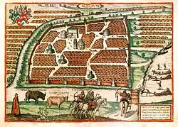 Первые изображения Кремля сохранились от конца XVI — начала XVII веков: план, помещённый в «Записках о Московии» австрийского посла Сигизмунда Герберштейна, и опубликованный голландским картографом Герритсом Гесселем план, получивший название «Кремленаград»[27][28]. Последний даёт представление о существовавшем тогда характере застройки Кремля. Среди тесно стоящих строений видны отчётливые очертания Соборной (Царской) и Ивановской площадей; от Ивановской площади две улицы ведут через северо-восточную часть крепости к Спасским (тогда Фроловским) и Никольским воротам; всю юго-западную часть занимает новый дворцовый комплекс, сооружение которого шло в течение всего царствования Бориса Годунова и завершилось в 1601—1603 годах[29][28]. Иранский дипломат Орудж-бек Баят, посетивший Москву в 1599 году, в своих записках заключал: «Дома в Кремле построены в стиле итальянских архитекторов и украшены красивыми орнаментами. Дворец царя особенно красив…»; он же писал о большом количестве в Кремле деревянных строений[30].