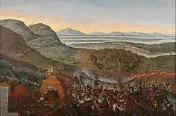 В мае 1683 года огромная турецкая армия под командованием Кара Мустафа-паши осадила Вену[45]. Турки медлили с последним штурмом и были разгромлены в Венской битве в сентябре этого же года войсками Габсбургов, немцев и поляков[45]. Поражение в битве вынудило турок 26 января 1699 года подписать со Священной Лигой Карловицкий мир, закончивший Великую Турецкую войну[46]. Турки уступили Лиге многие территории[47]. С 1695 года османы вели контрнаступление в Венгрии, оно закончилось сокрушительным поражением в битве при Зенте 11 сентября 1697 года[48].