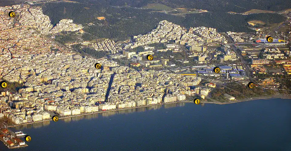 | 1. Белая башня 2. Площадь Аристотеля 3. Порт Салоник 4. Римская агора 5. Акрополь | 6. Ротонда св. Георгия 7. Университет Аристотеля 8. Выставочный центр 9. Стадион «Кафтанзоглио» 10. Археологический музей |