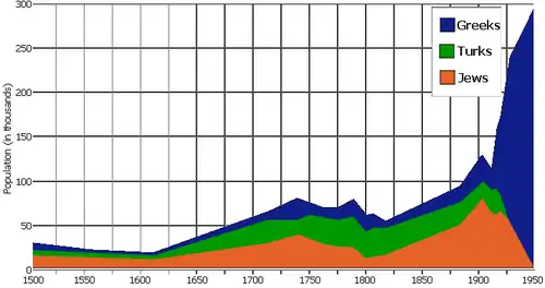 Во время османского правления евреи составляли больше половины населения города и большая часть торговли города была сосредоточена в их руках. В городе также была община евреев, перешедших в ислам, которые переселились в Салоники в 1680 г. и занимались в основном торговлей[33].