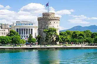 Главный архитектурный символ города — Белая башня, построенная на берегу залива в XVI веке на фундаментах более древних сооружений. Флагштоком для греческого флага над башней служит мачта турецкого броненосца «Фетих Булет» — флагманского корабля Эгейской эскадры, который был потоплен 18 октября 1912 года — в самом начале Балканской войны 1912 года — греческим миноносцем −11, сумевшим прорваться на заходе солнца в порт Салоники. Три выстрела, из которых два попали в цель, потопив турецкое судно, были сделаны Димитриосом Элевсиньотисом. Бюст командира миноносца Николаоса Воциса, ставшего в дальнейшем адмиралом, установлен перед Белой Башней.