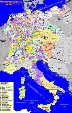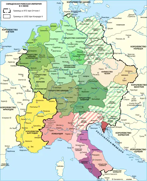 Государственные институты империи в ранний период оставались достаточно слабо дифференцированными. Император являлся одновременно королём Германии, Италии, а после смерти в 1032 году последнего бургундского короля Рудольфа III — и Бургундии[21]. Основной политической единицей в Германии являлись племенные герцогства: Саксония, Бавария, Франкония (существовало недолго), Швабия, Лотарингия (последняя в 965 году была разделена на Нижнюю и Верхнюю) и, с 976 года, Каринтия (отделена от Баварии)[22]. Вдоль восточной границы была создана система марок (Северная, Саксонская Восточная, Баварская Восточная, позднее — Мейсенская, Бранденбургская, Лужицкая). В 980-х годах славяне на некоторое время вновь отбросили немцев за Эльбу и захватили Гамбург, но в начале XI века империя восстановила свои позиции в регионе, хотя дальнейшее продвижение остановило вхождение королевств Польши и Венгрии на правах независимых королевств в европейское христианское сообщество. В Италии были также сформированы марки (Тоскана, Верона, Иврея), однако развитие коммунального движения к началу XII века разрушило эту структуру.