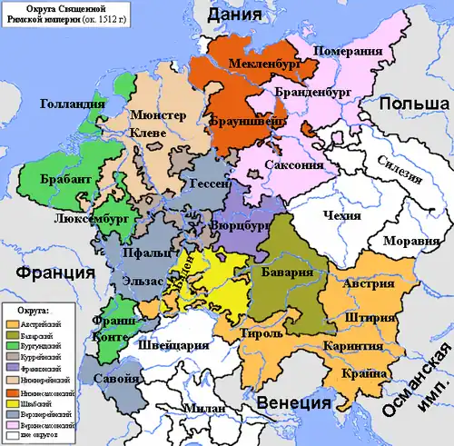 В 1495 году правитель Австрии Максимилиан I созвал в Вормсе всеобщий рейхстаг Священной Римской империи, на утверждение которого он представил проект реформы государственного управления империи. В результате обсуждения была принята так называемая «Имперская реформа». Германия была разделена на шесть имперских округов (в 1512 году к ним были добавлены ещё четыре)[54][55]. Органом управления округа стало окружное собрание, в котором имели право участвовать все государственные образования на территории округа: светские и духовные княжества, имперские рыцари и вольные города. Каждое государственное образование имело один голос (в некоторых округах это обеспечивало преобладание имперских рыцарей, мелких княжеств и городов, которые составляли главную опору императора). Округа решали вопросы военного строительства, организации обороны, набора армии, а также распределения и взимания имперских налогов. Рейхстагу, органу, представлявшему сословия, передавалась законодательная функция. Состав рейхстага не зависел от воли императора, результаты обсуждения вопросов в рейхстаге передавались последнему с тем, чтобы он обеспечивал исполнение решений[56]. Огромное значение имело также создание Высшего имперского суда — верховного органа судебной власти Германии, ставшего одним из главных инструментов влияния императора на территориальных князей и механизмом проведения единой политики во всех государственных образованиях империи[57].