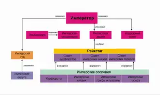 Процессы изменения взаимоотношений центральной власти с субъектами, входившими в состав империи, за всю историю существования империи происходили с тенденциями к децентрализации власти. Империя всю свою историю оставалась децентрализованным образованием со сложной феодальной иерархической структурой, объединявшей несколько сотен территориально-государственных образований. Во главе империи стоял император. Императорский титул не был наследственным, а присваивался по итогам избрания коллегией курфюрстов. Власть императора никогда не была абсолютной и ограничивалась высшей аристократией Германии, а с конца XV века — рейхстагом, представлявшим интересы основных сословий империи.