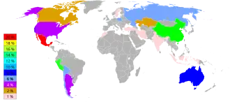 В 2008 году[34] всего добыто 20 900 т серебра. Лидером добычи является Перу (3600 т), далее следуют Мексика (3000 т), Китай (2600 т), Чили (2000 т), Австралия (1800 т), Польша (1300 т), США (1120 т), Канада (800 т).