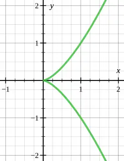 Особые точки включают в себя несколько типов точек, в которых кривая «пересекает сама себя», а также различные типы точек возврата. Например, на рисунке показана кривая x3 − y2 = 0 с точкой возврата в начале координат.