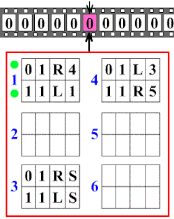 Основная идея, лежащая в основе машины Тьюринга, очень проста. Машина Тьюринга — это абстрактная машина (автомат), работающая с лентой отдельных ячеек, в которых записаны символы. Машина также имеет головку для записи и чтения символов из ячеек, которая может двигаться вдоль ленты. На каждом шаге машина считывает символ из ячейки, на которую указывает головка, и, на основе считанного символа и внутреннего состояния, делает следующий шаг. При этом машина может изменить своё состояние, записать другой символ в ячейку или передвинуть головку на одну ячейку вправо или влево[8].