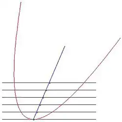 Рассмотрим параболу, заданную параметризацией γ(t) = (t + 2t2,t2). У этого есть уравнение x2 + 4y2 − 4xy − y = 0. Касательная в точке γ(0) имеет уравнение y = 0, и таким образом параллельные прямые заданы y = k для достаточно малых k ≥ 0. Линия y = k пересекает кривую в точке x = 2k ± √k. Расположение средних точек задается выражением {(2k,k) : k ≥ 0}. Это образует отрезок прямой, и поэтому предельная касательная к этому отрезку прямой, когда мы стремимся к γ(0), — это как раз линия, содержащая этот отрезок, то есть прямая x = 2y. В этом случае аффинная нормальная линия к кривой в точке γ(0) имеет уравнение x = 2y. Фактически, прямое вычисление показывает, что аффинный вектор нормали в точке γ(0), а именно ξ(0), задается формулой ξ(0) = 21⁄3·(2,1).[4] На рисунке красная кривая — это кривая γ, черные линии — это касательная линия и некоторые соседние касательные линии, черные точки — это середины отображаемых линий, а синяя линия — это геометрическое место средних точек.