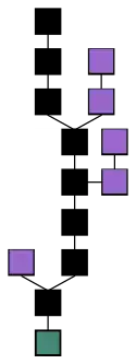 Основная последовательность блоков (чёрные) является самой длинной от начального (зелёный) до текущего. Побочные ветви (фиолетовые) отсекаются