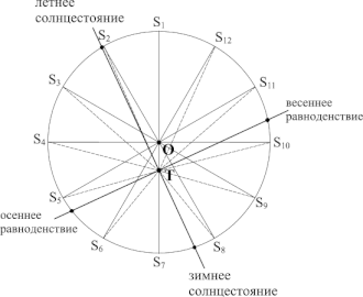 Если бы Солнце (в геоцентрической системе) равномерно двигалось по окружности с центром в центре Земли, то угловая скорость его перемещения по небу была бы постоянной и астрономические времена года имели бы равную продолжительность. Однако ещё Евктемон и позднее Каллипп установили, что продолжительность сезонов не одинакова: по собственным измерениям Гиппарха, более точным, чем у его предшественников, интервал между весенним равноденствием и летним солнцестоянием составил 94,5 дней, между летним солнцестоянием и осенним равноденствием — 92,5 дней. Поэтому согласно теории Гиппарха дневное светило равномерно движется по эпициклу, центр которого в свою очередь равномерно вращается по деференту. Периоды обоих вращений одинаковы и равны одному году, их направления противоположны, в результате чего Солнце равномерно описывает в пространстве окружность (эксцентр), центр которой не совпадает с центром Земли. Ван дер Варден[22] считает, что аналогичные теории Солнца создавались ещё раньше, в частности, Каллиппом в IV веке до н. э.