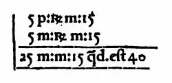 Начиная с XII века, античные и арабские труды стали проникать в Европу и переводиться на латинский язык. Одновременно, особенно в торговой среде, быстро распространяются индийские цифры и правила действий с ними. В первых сочинениях европейских математиков все формулы по-прежнему излагаются словесно. Первый (не слишком удобный) набросок алгебраической символики дал Лука Пачоли, крупнейший алгебраист XV века. Он ввёл в общее употребление обозначения для операции сложения и для вычитания (от итал. piu, meno), вполне аналогичные позднейшим плюсу и минусу. Для квадратного корня Пачоли использовал предложенные ещё Фибоначчи стилизованные буквы , от слова Radix (корень), с пометкой для корней степени выше второй. Пример записи Пачоли[23]: