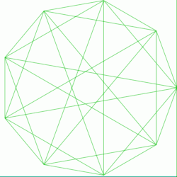 ![]() Этот комплексный многоугольник имеет 8 рёбер (комплексные прямые) с метками a..h и 16 вершин. Четыре вершины лежат на каждом ребре и в каждой вершине пересекаются два ребра. На левом рисунке квадраты не являются элементами многогранника, но нарисованы исключительно помочь распознать вершины, лежащие на той же самой комплексной прямой. Восьмиугольный периметр левого изображения не является элементом многогранника, но он является многоугольником Петри[3]. На центральном рисунке каждое ребро представлено как вещественная прямая и четыре вершины на каждой прямой можно легко видеть. |