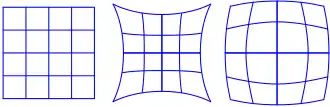 Дисторсия (посередине и справа) как пример неконформного отображения квадрата.