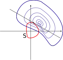 Нарисуем на плоскости линии уровня функции (то есть кривые ). Из геометрических соображений следует, что точкой (возможно — точками) условного экстремума функции может быть только точка касания кривой и некоторой линии уровня, то есть точкой, в которой касательная к и касательная к этой линии уровня — совпадают. Действительно, если в некоторой точке кривая пересекает линию уровня трансверсально (то есть под некоторым ненулевым углом), то при движении по кривой из точки можно попасть как на линии уровня, соответствующие значению, большему , так и на линии уровня, соответствующие значению, меньшему . Следовательно, такая точка не может быть точкой экстремума.