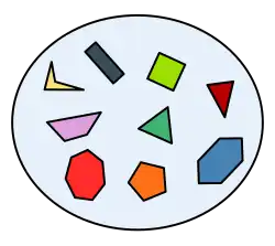 - Система множеств (множество множеств) — множество, все элементы которого также являются множествами, обычно схожего происхождения (например, все они могут быть подмножествами некоторого другого множества)[7].