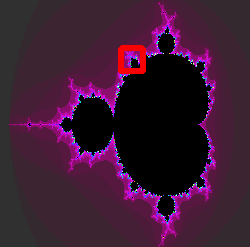 Множество Мандельброта и само содержит структуры, напоминающие множество Жюлиа: для любого c область множества Мандельброта около c напоминает центр множества Жюлиа с параметром c. Если сильно увеличить множество Мандельброта в граничной точке c и то же самое проделать с множеством Жюлиа для этого же значения c и в этой же точке, то картины будут асимптотически стремиться друг к другу при всё больших увеличениях.