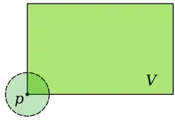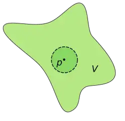• Приведённые выше определения не требуют, чтобы окрестность была открытым множеством, но лишь чтобы она содержала открытое множество . Некоторые авторы настаивают на том, что любая окрестность открыта.[1] Тогда окрестностью множества называется любое содержащее его открытое множество. Это не принципиальное для развития дальнейшей топологической теории различие. Однако в каждом случае важно фиксировать терминологию.