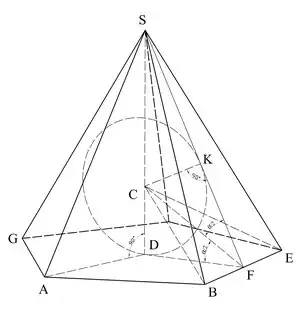- где — апофема , — периметр основания, — число сторон основания, — боковое ребро, — плоский угол при вершине пирамиды.